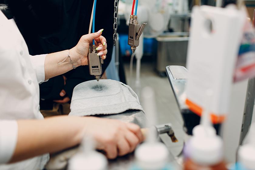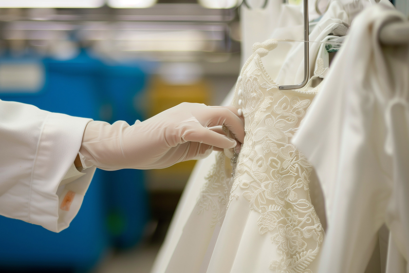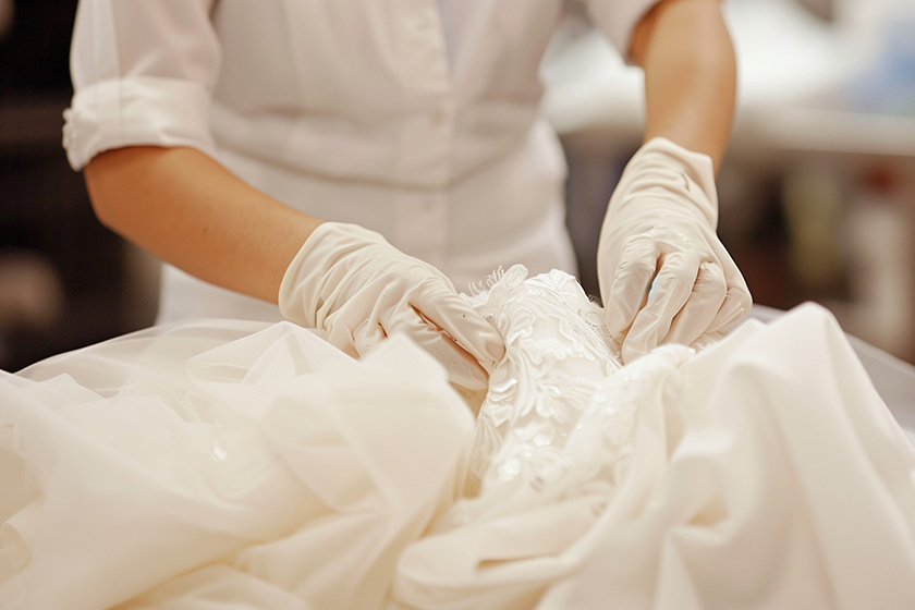 必要に応じて、しみ抜き・修繕・色補正といった特殊加工を施した上で、仕上げのアイロン掛けに進みます。和装・ドレス・紳士服それぞれに独自の特殊仕上げ台を導入し、作業の効率化を図りながら、商品の型や風合いを損なうことなく仕上げています。