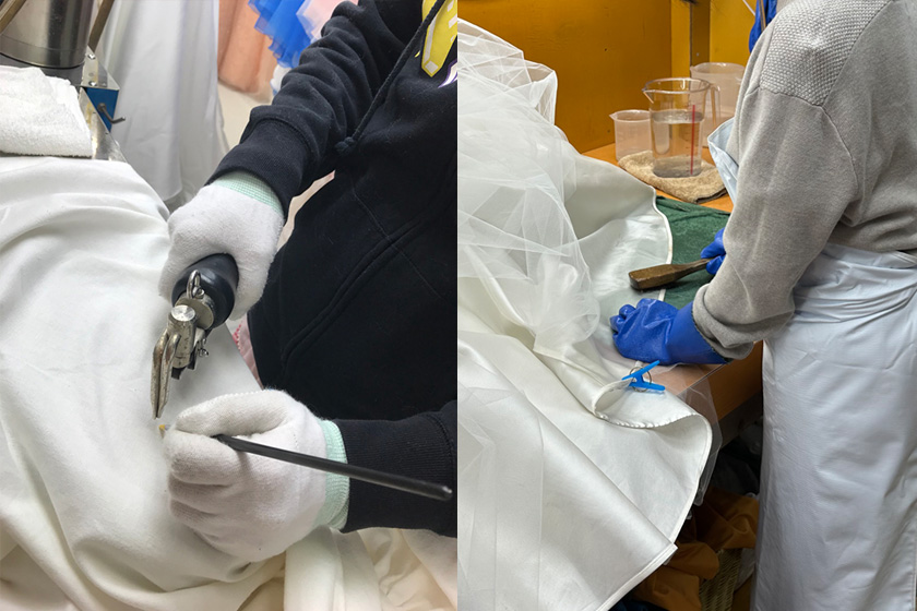 クリーニングを終えた婚礼衣裳に、帯・小物・アクセサリーなど付帯品を正しく組み合わせ、出荷に備えたセットアップを行います。衣裳一点ごとに確認を徹底し、紛失や不備のないよう丁寧に整えます。お客様や式場に届いた瞬間からすぐに使用できる状態を実現することで、円滑な式準備をサポートいたします。