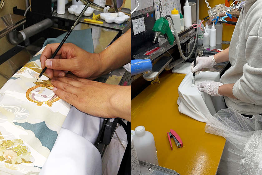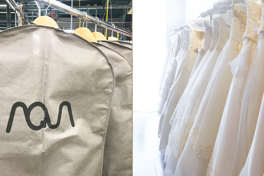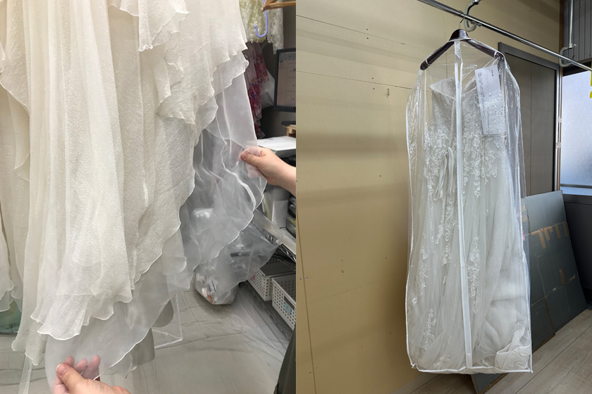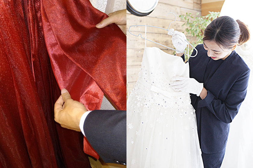 クリーニングはもちろん、会場への配送、ドレスを広げて設営を行うまで